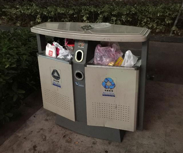 小區外街道上的垃圾桶也被小區里的生活垃圾填滿。