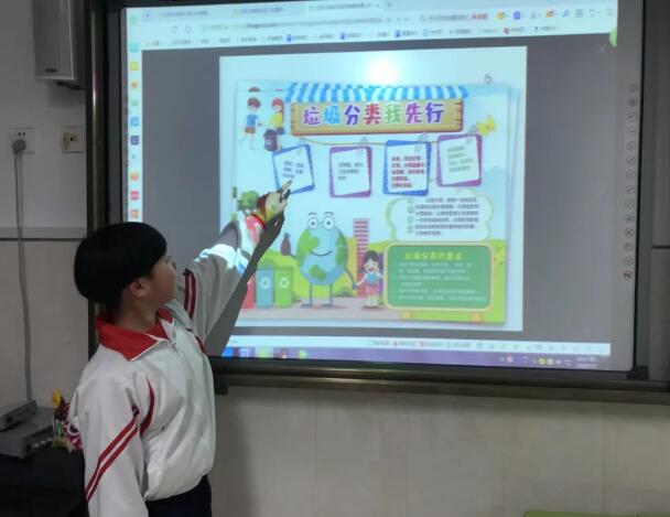 在手抄報制作開始前,老師以“什么是垃圾分類”這個問題為開頭開始今天的活動,先讓學生們回答這個問題。“垃圾分類就是按照豬吃不吃來分的”,其中一個學生的回答把老師和其他學生都逗笑了。緊接通過視頻和老師的講解展示了垃圾分類的類型,之后老師給每位同學發了兩張小卡片,卡片上有各種垃圾圖案,讓學生以小火車的方式上來把小卡片貼在正確的垃圾桶標志內。