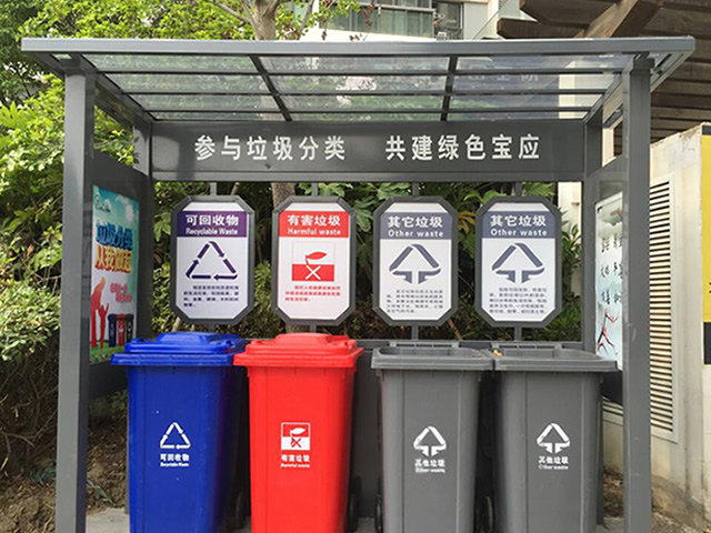 目前,戶外物業(yè)小區(qū)四分類垃圾房是城市生活垃圾處置的主流趨勢,也是現(xiàn)代城市文明進步的標志之一,有利于提升垃圾清運效率,便于再生資源的回收利用,減少環(huán)境污染,緩解環(huán)衛(wèi)工人常規(guī)保潔的壓力。垃圾分類亭,分為地基基礎(chǔ)設(shè)施、公益宣傳欄、立柱、頂棚等,亭內(nèi)設(shè)置可回收、有害垃圾、廚房垃圾和其他垃圾等垃圾桶,垃圾桶及宣傳欄配有垃圾分類的宣傳標語,廣大群眾可以根據(jù)垃圾桶的提示標語,將廢棄的生活垃圾投放到對應(yīng)的垃圾桶中。