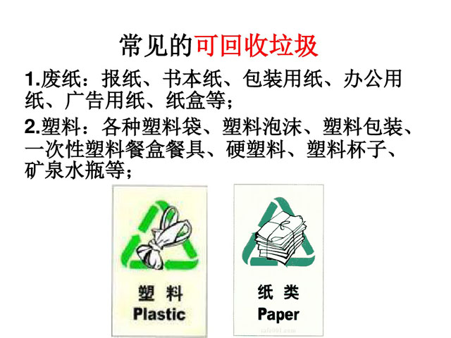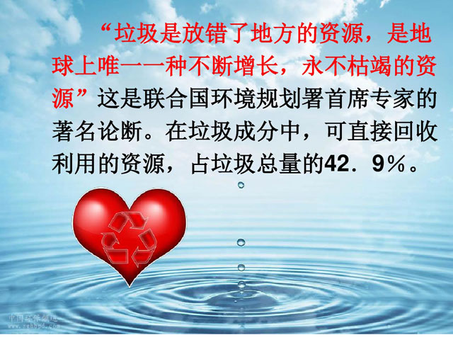 ? ? 垃圾是放錯(cuò)了地方的資源,是地球上唯一一種不斷增長(zhǎng),永不枯竭的資源,這是聯(lián)合國(guó)環(huán)境規(guī)劃署首席專(zhuān)家的著名論斷。在垃圾成分中,可直接回收利用的資源占垃圾總量的42.9%。所以垃圾分類(lèi)回收是一件利在千秋,功在當(dāng)代的十分重要的事情。學(xué)校作為培養(yǎng)青少年文化素養(yǎng)的教育基地,培養(yǎng)孩子的垃圾分類(lèi)意識(shí)與能力是必不可缺的,以下是分類(lèi)垃圾桶網(wǎng)為大家收集的校園垃圾分類(lèi)ppt,旨在輔助教師教育孩子,讓他們擁有社會(huì)主人翁意識(shí),努力從自身做起,從小事做起,保護(hù)環(huán)境,節(jié)約資源。
