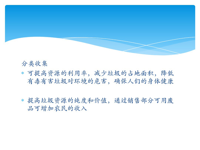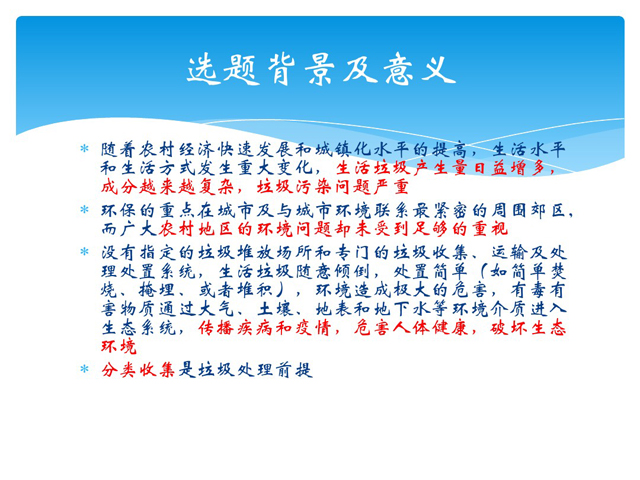 隨著農村經濟發展和城鎮化水平的提高,生活水平和生活方式發生重大變化,生活垃圾產生 量日益增多,成分越來越復雜,垃圾污染問題嚴重。環保的重點在城市與城市環境聯系最緊密的周圍郊區,而廣大農村地區的環境問題卻未收到足夠的重視;沒有指定的垃圾堆放場所和專門的垃圾收集、運輸及處理處置系統,生活垃圾隨意傾倒,處置簡單(如簡單焚燒、掩埋、或者堆積),環境造成極大的危害,有毒有害物質通過大氣、土壤、地表和地下水等環境介質進入生態系統,傳播疾病和疫情,危害人體健康,破環生態環境,以下農村生活垃圾分類ppt由分類垃圾桶網收集整理。