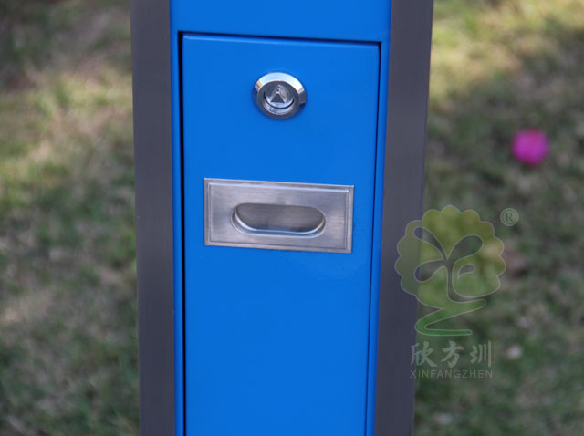 C635戶外吸煙柱規格250*250*1180mm,呈長條傳,側面有三角鑰匙,可以打開側門,方便清理位于內套管的煙蒂煙灰,底座分兩種,一種是室內采用的,在底部裝有防滑墊,一種是戶外采用的,底部使用膨脹螺絲固定。