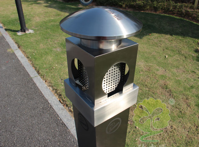 C618室外街道滅煙柱采用優質不銹鋼剪切、組裝、焊接、絲印而成,它包括外套管、支座、內套管、煙灰盒、底座。外套管的底端固定連接在支座上,外套管的側壁上設有煙蒂置入口,內套管用于集中收納從外套管的煙蒂置入口投入的煙蒂,內套管設在外套管的內管腔中,內內套管的開口端朝上,煙蒂置入口與內套管的開口相連通,以使得從煙蒂置入口投入的煙蒂可從內套管的開口端落入到內套管的內管腔中;