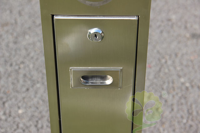 C618室外街道滅煙柱規格248*248*1175mm,呈長條傳,側面有三角鑰匙,可以打開側門,方便清理位于內套管的煙蒂煙灰,底座分兩種,一種是室內采用的,在底部裝有防滑墊,一種是戶外采用的,底部使用膨脹螺絲。