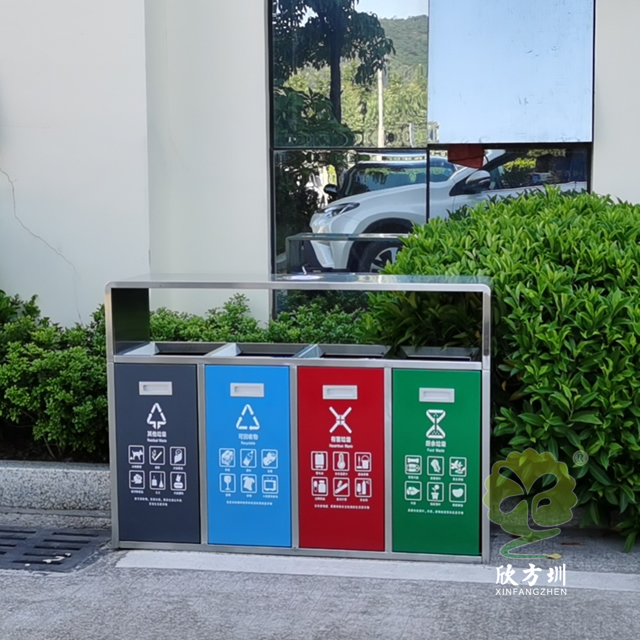 戶外廣場四分類不銹鋼垃圾箱一種存放垃圾的容器,可以采用201、304、316等不銹鋼制作,表面可以采用烤漆、噴塑、鏤空、UV打印等工藝處理,因為不銹鋼耐空氣、蒸汽、水等弱腐蝕介質和酸、堿、鹽等化學浸蝕性介質腐蝕,所以不銹鋼垃圾桶耐用性高。全身不銹鋼制作的垃圾桶還具有防火功能,堅固耐用。