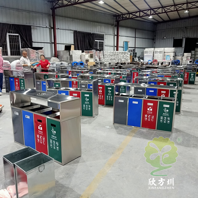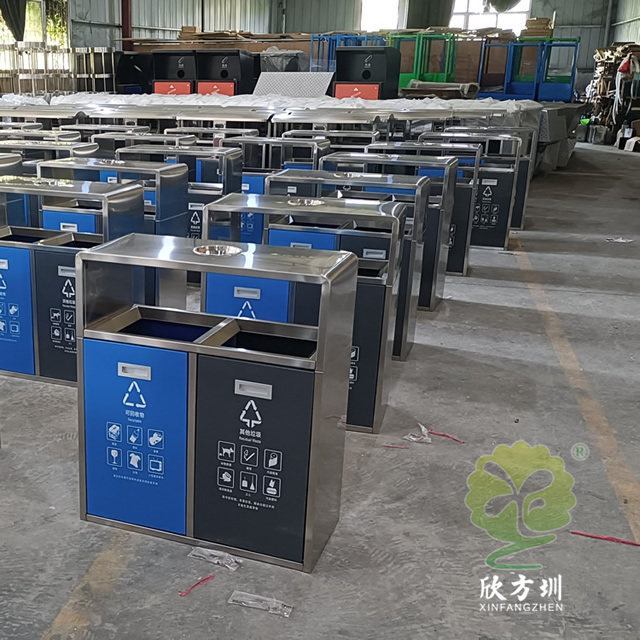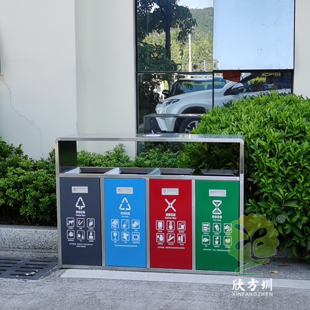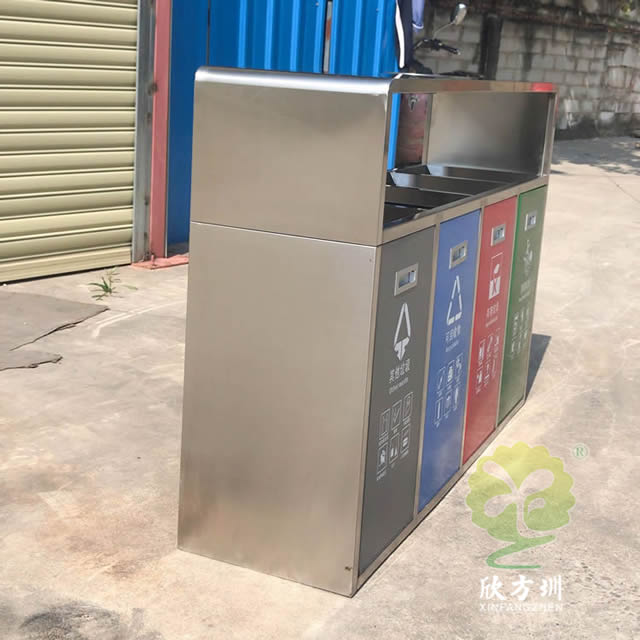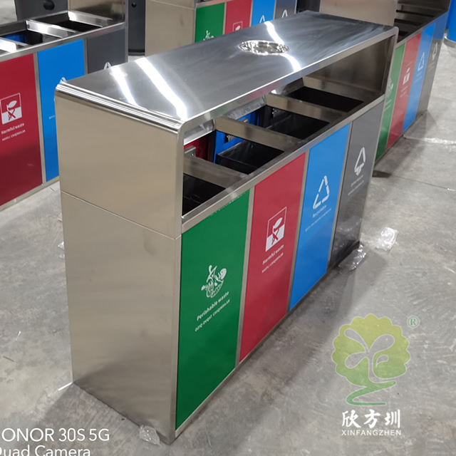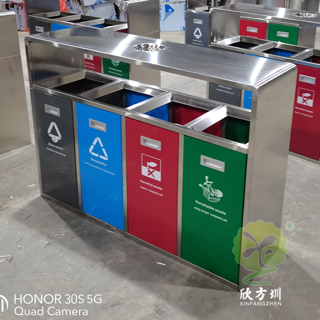 戶外連體四色不銹鋼分類垃圾桶可以選用201/304不銹鋼板制作,戶外方形四分類設計,正面門板采用了磁吸式下拉開門可以取出內筒,四個門板使用了四種噴塑顏料上色,噴塑了灰色、藍色、紅色、綠色絲印對應的國家最新分類標識,開料前期頂部可以選擇性需不需要煙灰盅,可以定制兩分類、三分類、五分類的這款垃圾箱。不銹鋼連體垃圾桶是欣方圳設計生產的一款經典熱銷垃圾桶,這款垃圾桶雖然使用不喜歡制作而成,但是外形采用了方形分類,使其看起來有一股自然大方氣質,特別適合各種歷史景區、戶外公園、別墅小區、學校廣場等場景使用。這款垃圾桶外表經過防腐工藝處理,防水防腐蝕、經久耐用、工藝精湛、物美價廉。如果你對這款垃圾桶感興趣,請直接聯系我們報價。