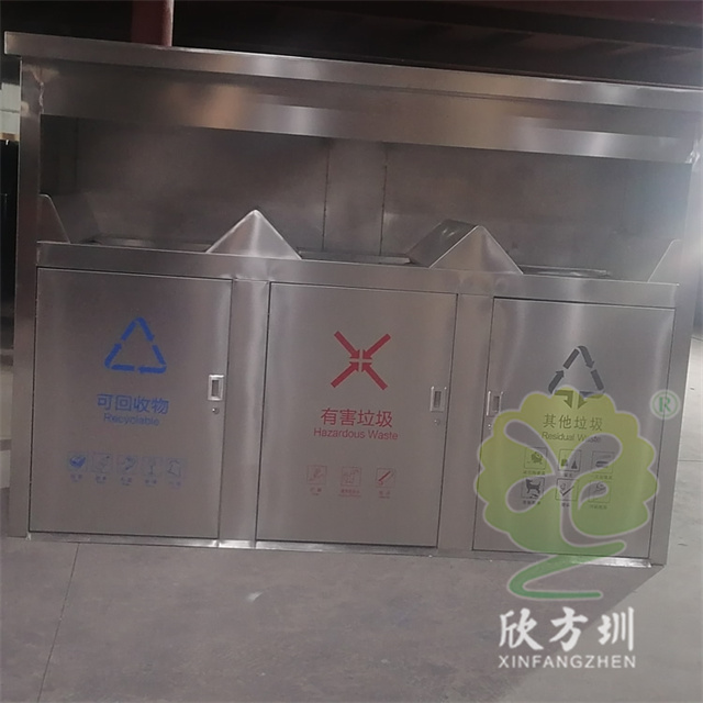 戶外城鎮密閉式三連體不銹鋼分類垃圾桶桶身采用優質 201#不銹鋼 1.0mm 厚度生產的,戶外連體三分類屋形設計,絲印單色的分類標識,可回收物藍色油墨,有害垃圾紅色油墨,其他垃圾黑色油墨,頂部和投口都采用了油墨絲印了黑色名稱標識,箱體不帶里面的塑料內筒,內筒是使用常規240L塑料垃圾桶。
