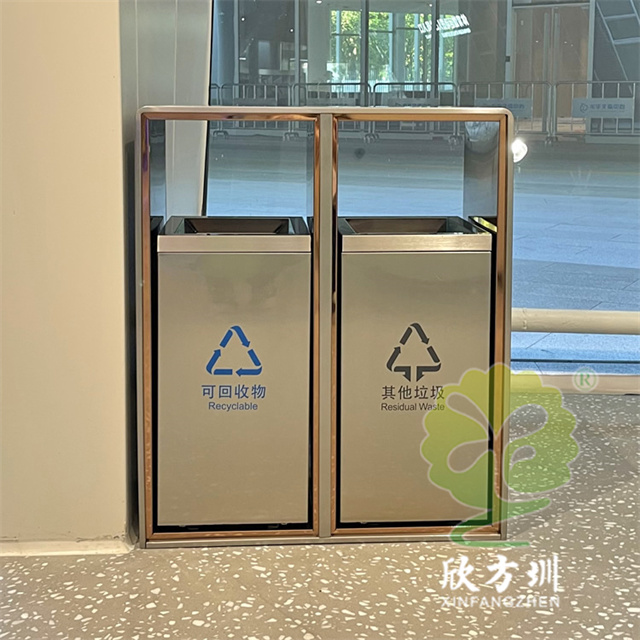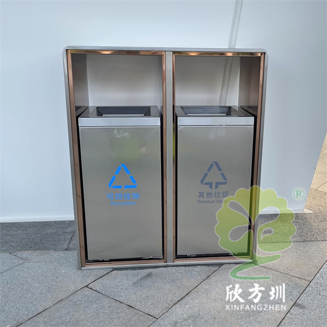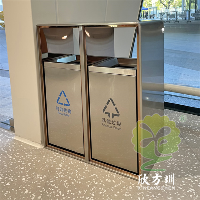 文化廣場電鍍滑軌不銹鋼分類垃圾桶采用了201#不銹鋼板制作而成,兩連體方形分類抽拉式滑軌設計,垃圾箱桶身整體為金色本色,內框架采用了電鍍香檳金邊框,雙面投口外桶資訊位置絲印單色的最新國標分類標識,可回收物油墨絲網印刷了藍色、其他垃圾油墨絲網印刷了灰色,這款垃圾桶高檔輕奢美觀大氣。