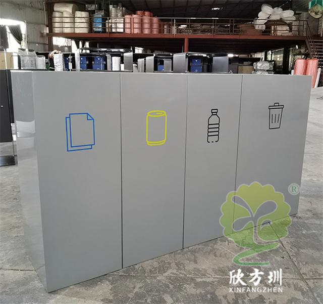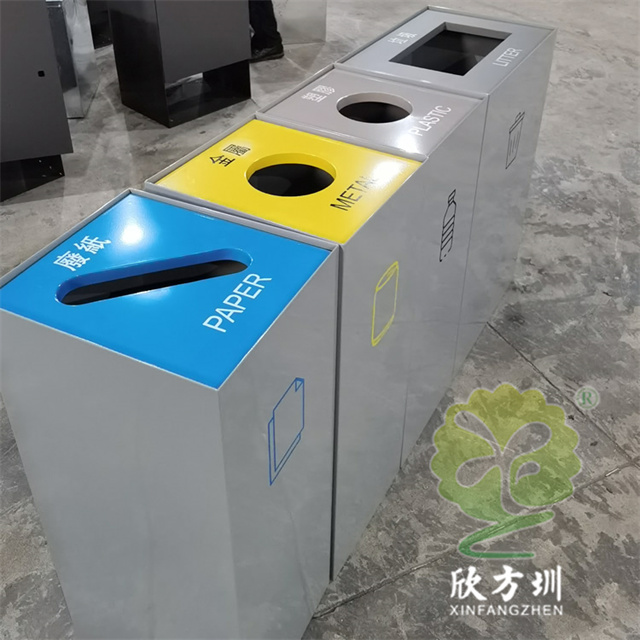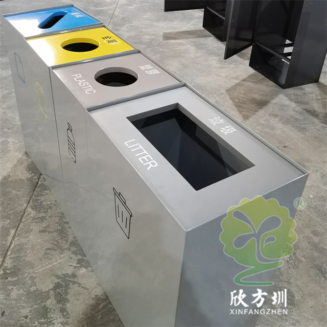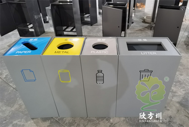 室內商用組合不銹鋼4分類垃圾桶采用了1.00mm厚201#不銹鋼板制造而成,立式直投口組合式四分類設計,分別可以回收紙類、金屬、塑料和帶一個大一點的其他垃圾桶,投口蓋好和正反面絲印中英文文字跟分類標識,紙類投口藍色噴塑跟藍色油墨絲印蓋子白色絲印,金屬黃色噴塑跟黃色油墨絲印蓋子黑色絲印,塑料淺灰色噴塑和黑色絲印蓋子白色絲印,其他垃圾灰色噴塑蓋子跟桶一樣的顏色桶身標識黑色絲印蓋子白色油墨絲印,這樣可以明顯區分辨認桶的分類。