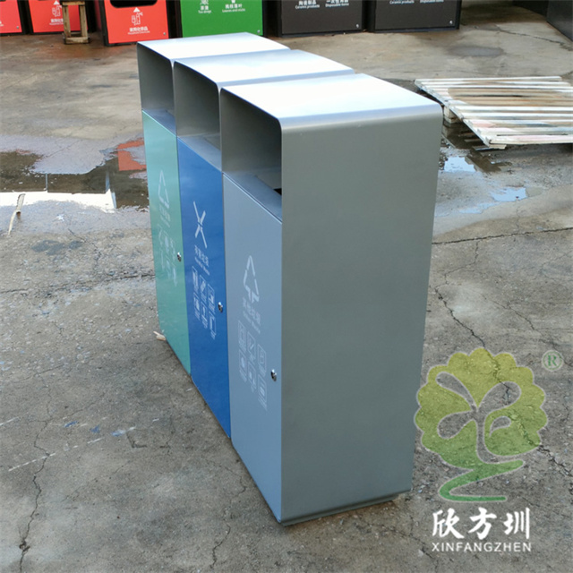 室外加厚組合三色不銹鋼分類果皮箱使用了201#不銹鋼板制作,外部框架采用了2.5mm厚,桶身采用了1.0mm厚的不銹鋼板裁剪折彎制造,單筒雙面側面投口方形設計,可以任意自由組合分類,外部框架噴塑灰色,門板正反面噴塑了不同的顏色,可回收物噴塑淡藍色、有害垃圾噴塑天藍色、其他垃圾噴塑了淡灰色,可以組合制作兩分類、四分類、五分類。