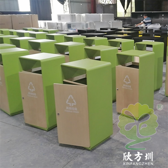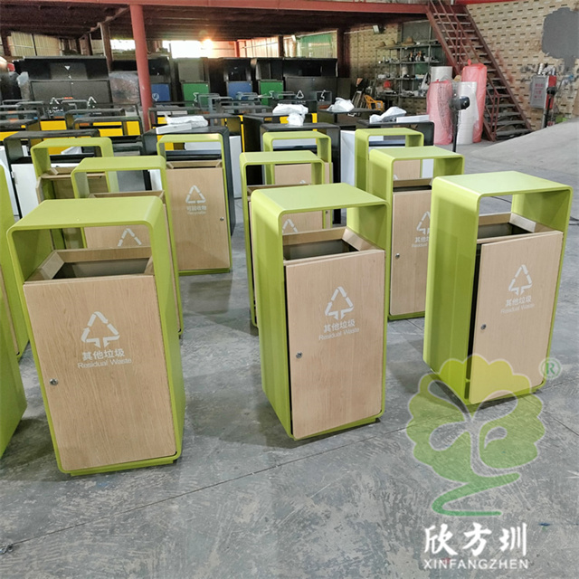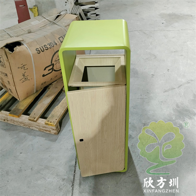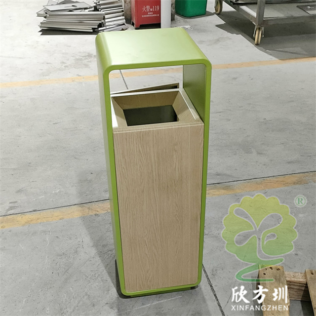 室內戶外轉木紋方形不銹鋼垃圾桶采用了304不銹鋼板制造而成,方形雙面投口單筒設計,桶身框架采用了淡綠色噴涂噴塑上色,框架板材雙層折彎更佳耐用,桶身雙面門板采用了轉木紋工藝制作,內筒可以使用三角鑰匙打開門板取出內置的內筒,正反面絲網印刷了白色的其他垃圾最新國標,可以定制雙分類或者多分類的桶。