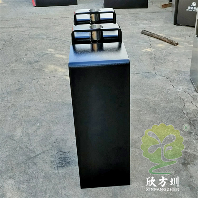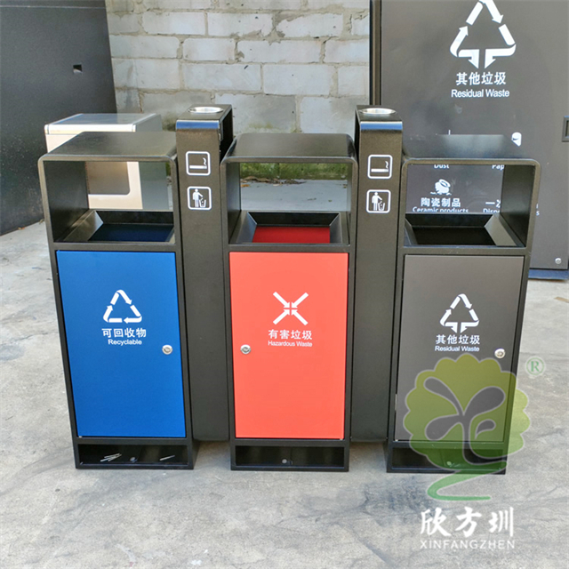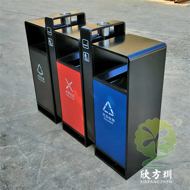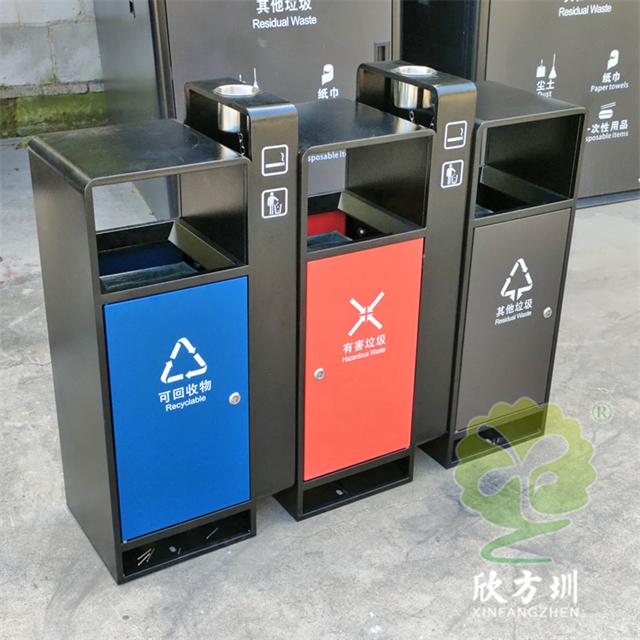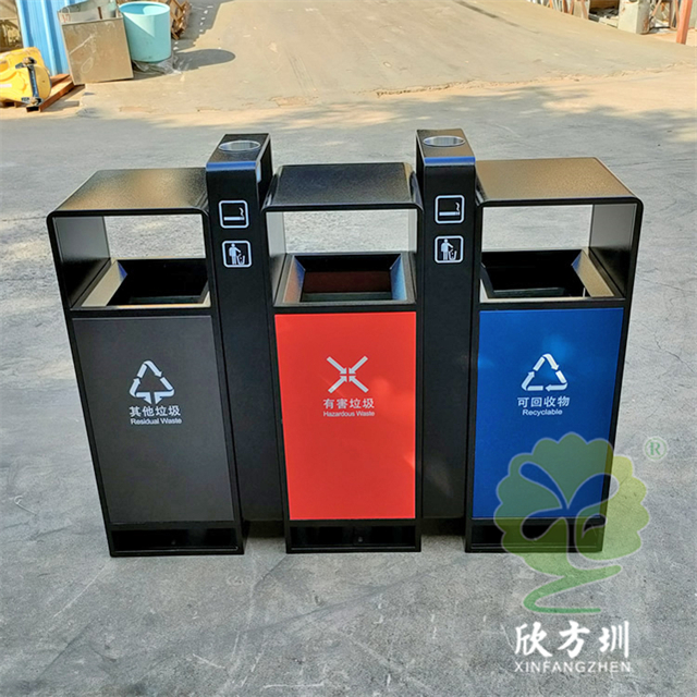 戶外小區街道三色連體不銹鋼分類垃圾桶采用了201不銹鋼板制作而成,三色連體分類方形設計,桶身整體黑色噴漆噴塑上色,門板采用了三種塑粉,可回收物噴塑了藍色,有害垃圾噴塑了紅色,其他垃圾噴塑了灰色,門板兩面絲網印刷了國標分類標識,底部凸起部位帶倆個煙灰盅,這款可以定制兩分類或者四分類以及冷軋鋼板垃圾箱。