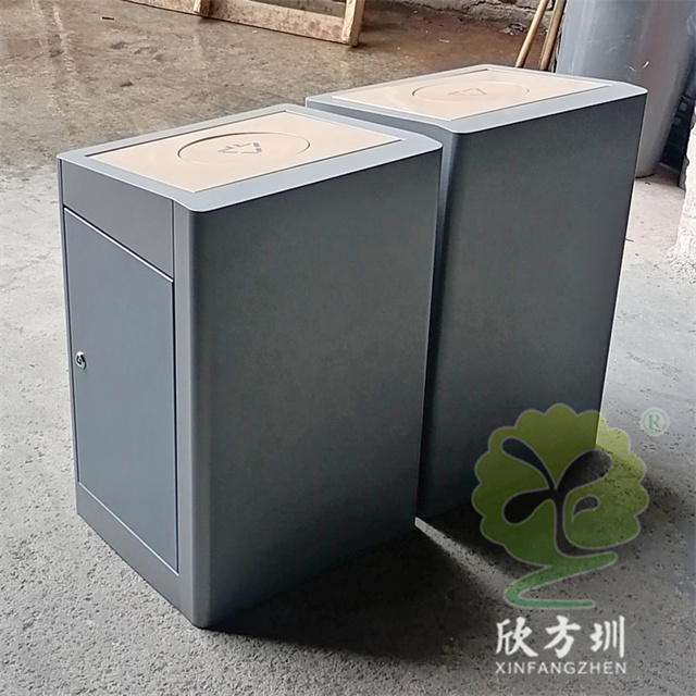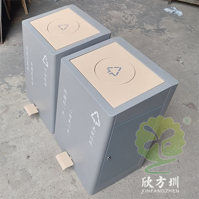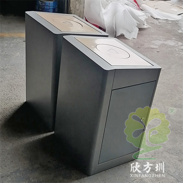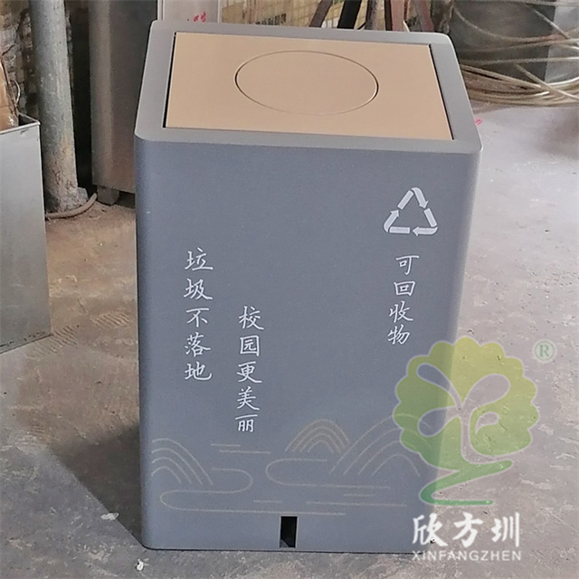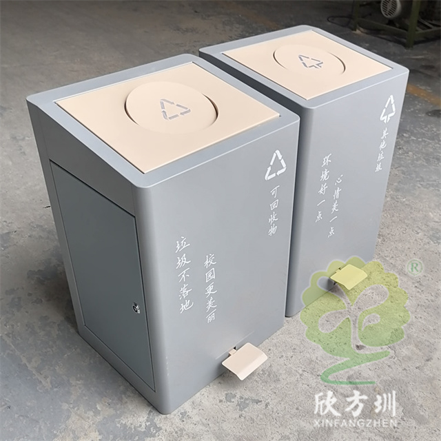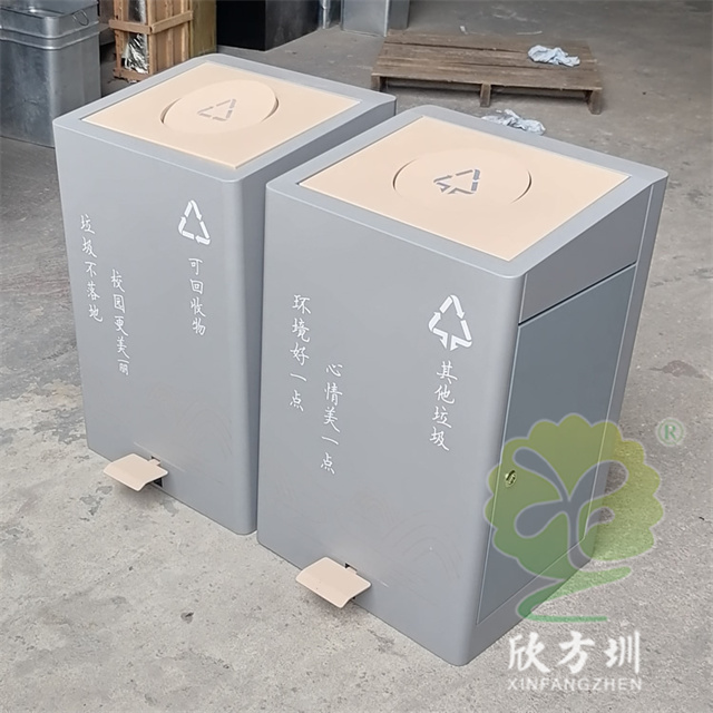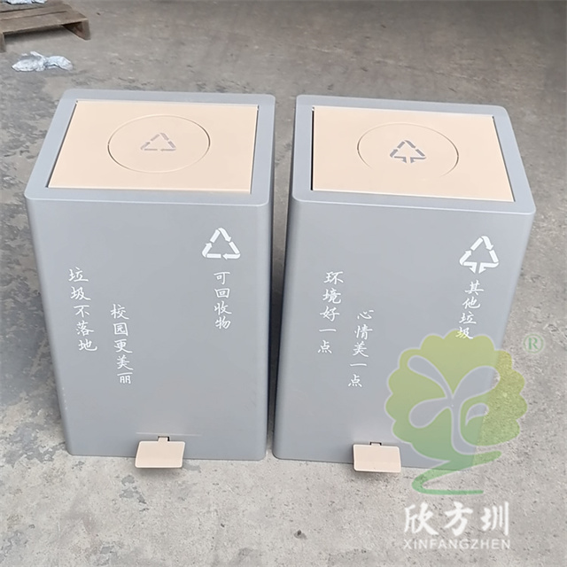 室內校園腳踏式不銹鋼分類垃圾桶外桶整體優質201不銹鋼生產,厚度1.0mm厚度(足0.92mm),方形組合式帶腳踏蓋子加搖蓋雙開蓋設計,顏色按照甲方要求顏色噴塑,外桶表面整體噴塑淺灰色,使用了白色油墨絲印了可回收物和其他垃圾分類標識和文字。