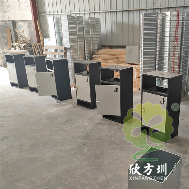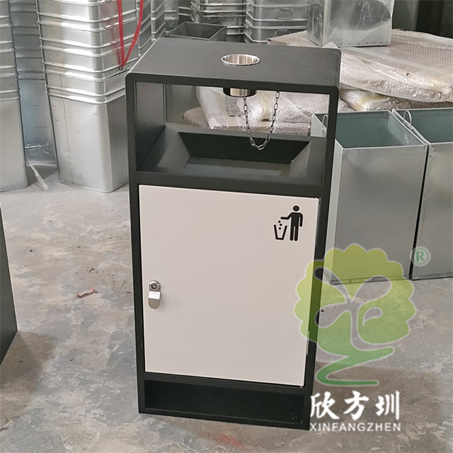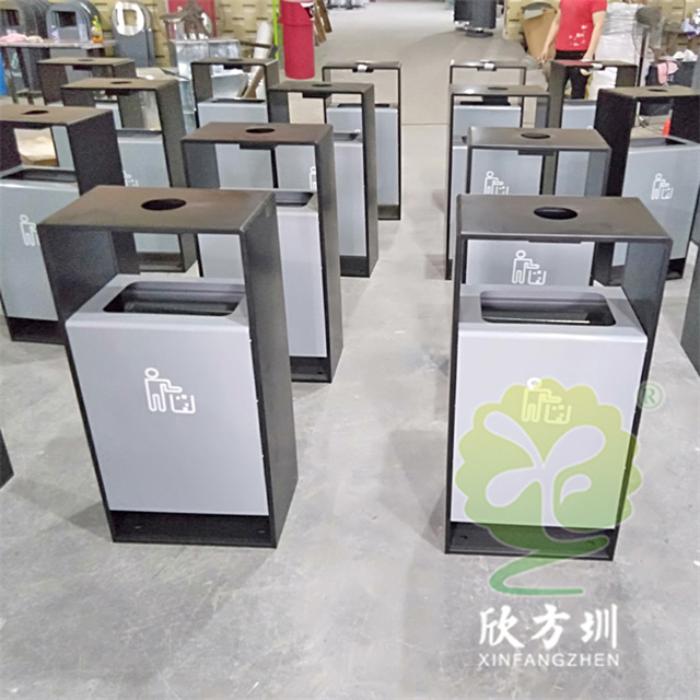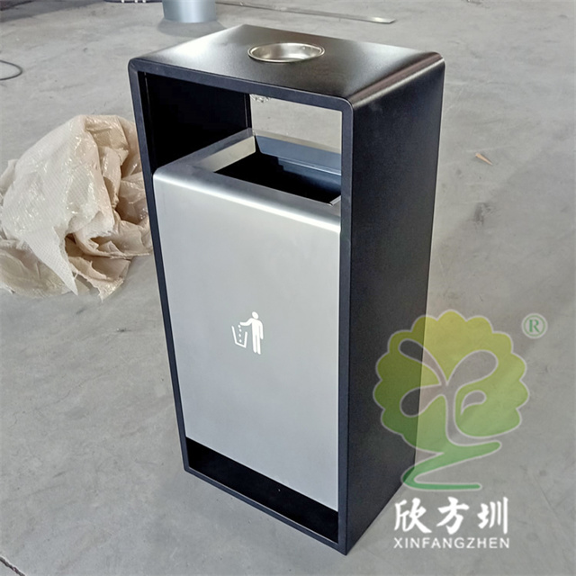 戶外小區簡易方形噴塑不銹鋼垃圾桶可以選用不銹鋼或者鍍鋅板制作,這款果皮箱框架噴涂黑色塑粉桶身噴塑銀色,表面可以根據用戶要求定制,頂部中心位置帶圓形的煙灰盅,投口帶折邊,桶身離地面比較高也有效避免雨水進入,可以絲印logo人頭標或分類標識。