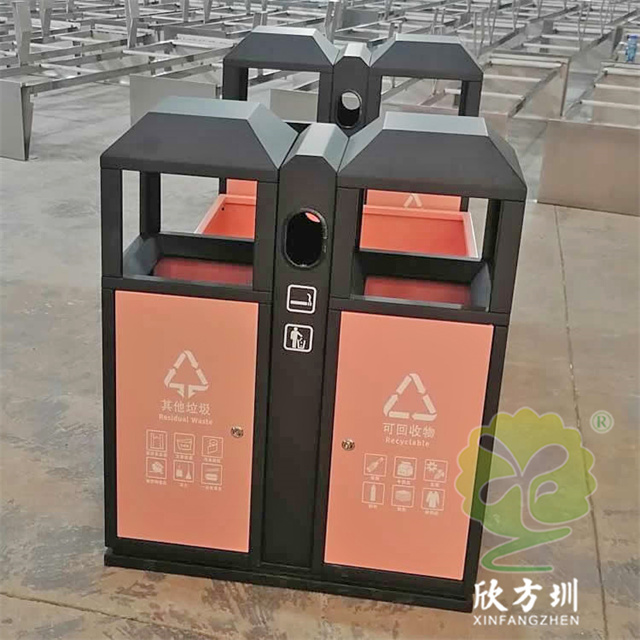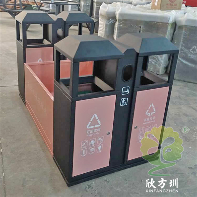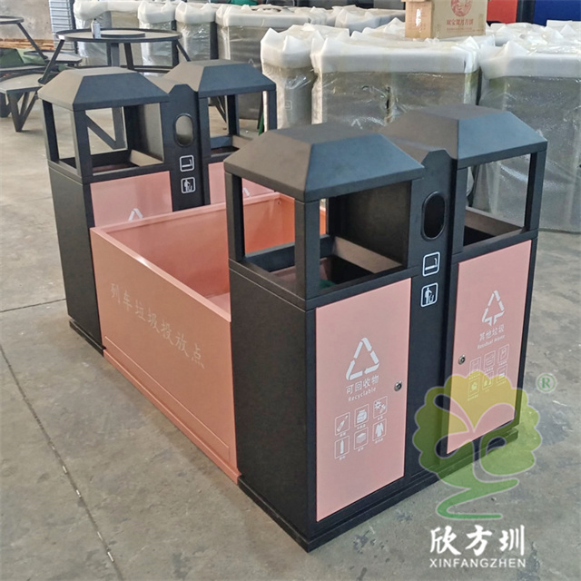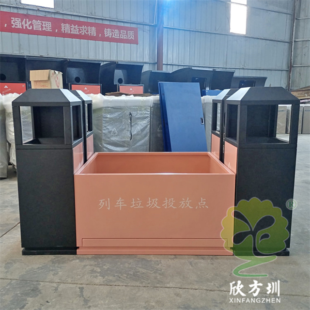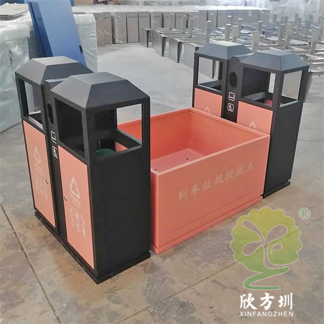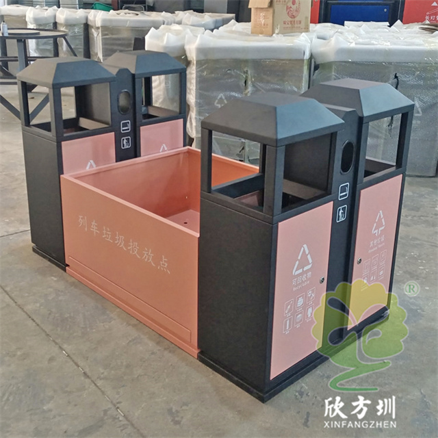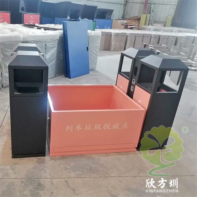 高鐵站火車站組合式不銹鋼分類垃圾桶材質(zhì)可以使用304不銹鋼板1.2mm厚制作,可以選擇鍍鋅板、201不銹鋼板定制,框架黑色噴粉烤漆,投放點和門板粉色噴塑,組合式兩個雙分類桶設(shè)計,絲網(wǎng)印刷最新國標(biāo)分類標(biāo)識和列車?yán)斗劈c,雙桶側(cè)面中上部分雙面帶煙灰盅,可以定制形狀尺寸和顏色。