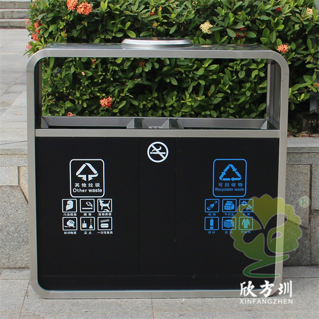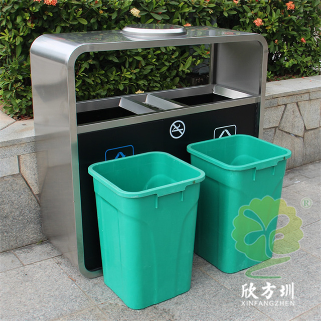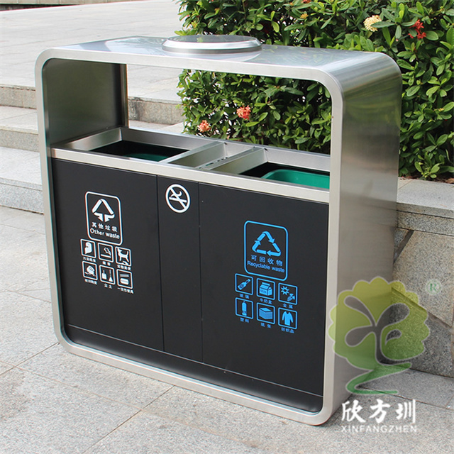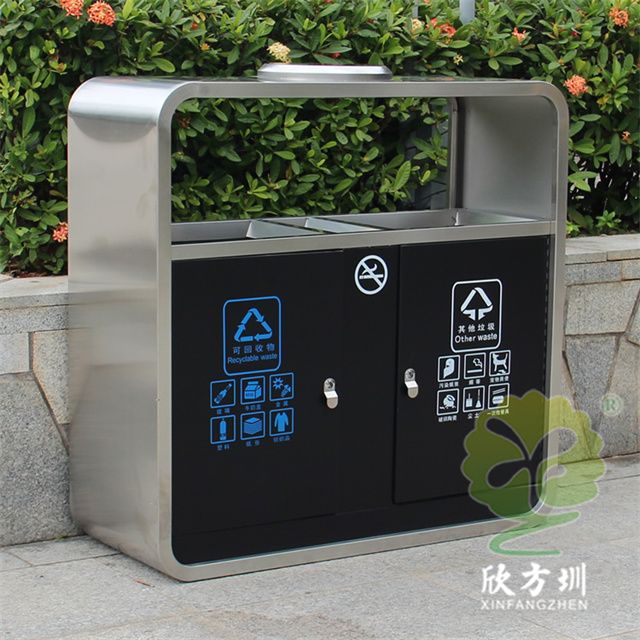 戶外市政街道不銹鋼分類垃圾桶可以采用201不銹鋼或者304不銹鋼板制造,頂部中心位置凸起出是這款桶創意方形兩連體設計,正反面油墨絲網印刷最新國標分類標識和禁煙標識,側面可以定制絲印企業logo,垃圾桶兩個方形投口中間位置帶滅煙盒,帶三角鑰匙開門方便環衛工人清理內置廢物。