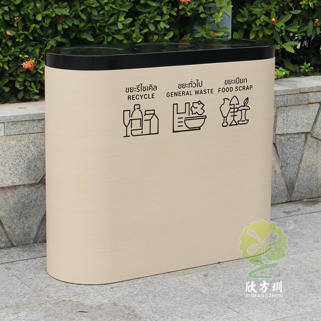 出口轉木紋鍍鋅板三分類垃圾桶是欣方圳設計生產的一款時尚藝術垃圾桶,這款垃圾桶工藝精湛、外形美觀、非常受市場歡迎,被許多采購客戶擺放于酒店、公寓、賓館、商場等高檔場所。如果您有采購垃圾桶的需求,請聯系我們報價,我們也接受來圖定制,期待與您的合作。