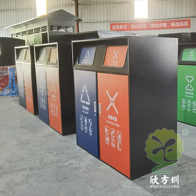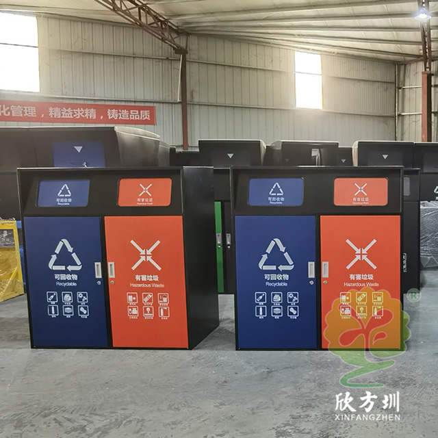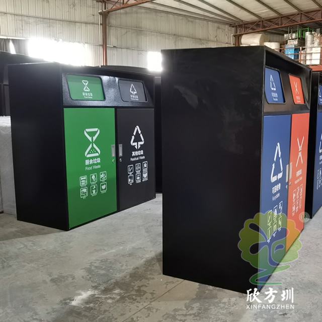 戶外組合帶蓋鍍鋅板分類垃圾桶外桶采用了鍍鋅板制作而成,兩連體組合分類方形搖擺蓋設(shè)計,外桶表面黑色噴涂噴塑,這款垃圾桶用戶是兩套組合成了四分類,門板和蓋子噴塑了不相同的顏色,廚余垃圾噴塑了綠色,其他垃圾噴塑了黑色,可回收物噴塑了藍(lán)色,有害垃圾噴塑了紅色,門板上絲印了最新國標(biāo)分類標(biāo)識,可以使用三角鑰匙開門取出內(nèi)筒。